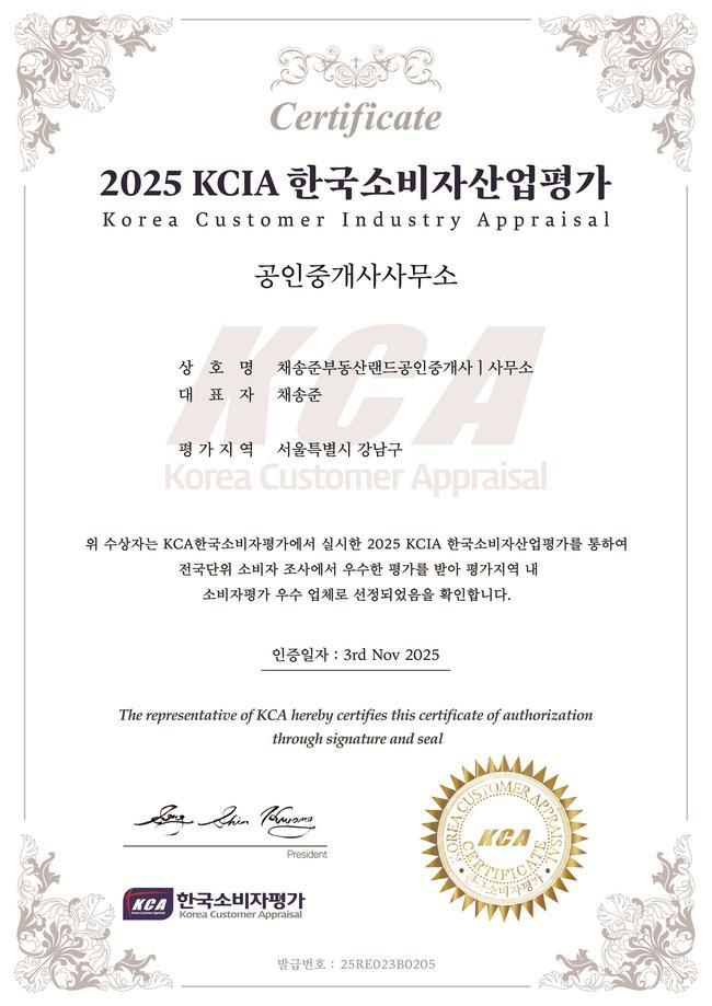 지난 11월 3일서울 강남구, 대한민국 부동산 시장의 심장이라 불리는 이 지역에서 ‘채송준부동산랜드공인중개사사무소(대표 채송준)’가 2025년 KCIA 한국소비자산업평가(Korea Customer Industry Appraisal)에서 부동산중개 부문 우수업체로 선정되었다.