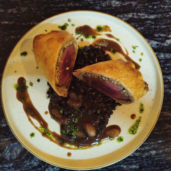 양갈비 필레 앙 크루트 – 웰링턴 스타일 신선한 허브(파슬리·민트·타라곤·겨자잎)로 마리네이드한 양갈비 필레에 디종 머스타드를 바르고 버섯과 퍼프 페이스트리로 감싸 구웠습니다.