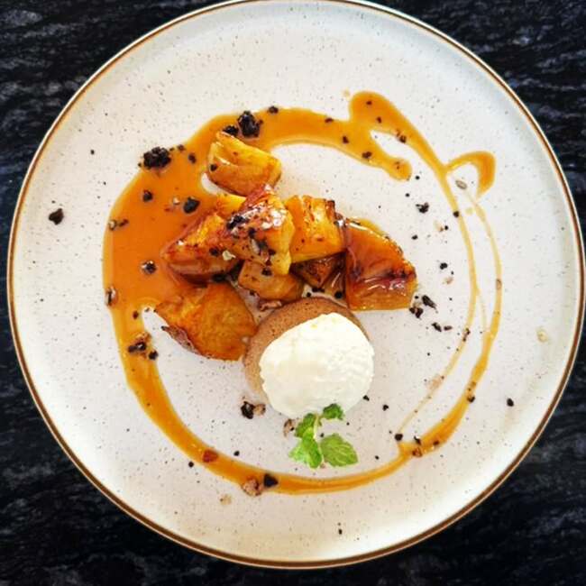 구운 파인애플 – 삼판 럼, 바닐라 아이스크림 & 초콜릿 크럼블 완벽하게 구운 파인애플을 삼판 럼으로 플람베해 따뜻하고 향긋한 풍미를 더했습니다.