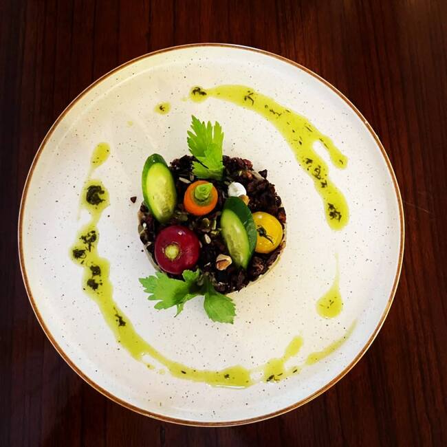 가지 카르마 – 칼라마타 올리브 크럼블 & 프렌치 가든 야채부드러운 가지 카르마 위에 칼라마타 올리브 크럼블을 올리고,싱싱하고 아삭한 프렌치 야채를 곁들여 비건·채식 고객에게도 훌륭한 프렌치 플랜트 베이스 메뉴입니다.