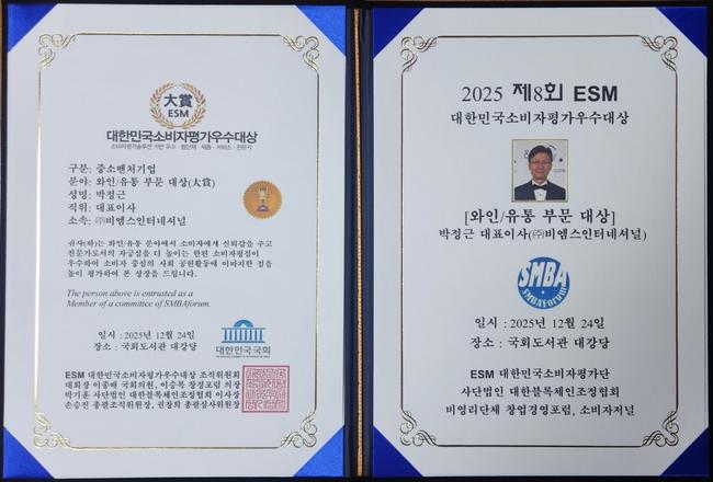 2025년 연말, 국내 와인·유통 업계를 대표하는 기업 ㈜비엠스인터네셔널(대표이사 박정근)이 와인·유통 부문에서 2년 연속 ‘대한민국소비자평가우수대상’을 수상하는 영예를 안았다. 이로써 비엠스인터네셔널은 국회도서관 대강당에서 개최된 ‘2025 ESM 대한민국소비자평가우수대상 시상식’에서 제품·서비스 대상(제조·유통·서비스 부문) 와인·유통 분야의 최종 수상자로 선정됐다.