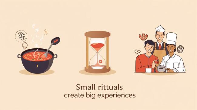 재미있는 사실은, 의식이 반드시 오래된 전통일 필요는 없다는 점입니다. 우리는 얼마든지 우리만의 새로운 의식을 ‘창조’할 수 있습니다. 예를 들어, 어떤 김치찌개 식당에서 이런 아이디어를 실행한다고 상상해 봅시다.