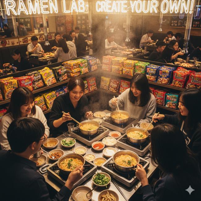 ‘김철수’는 수동적으로 음식을 받아먹는 것을 넘어, 식사 과정 자체를 즐기고 싶어 한다. 나는 ‘볶음밥 연구소’ 옆에 작은 ‘라면 연구소’를 추가했다. 신라면, 진라면, 너구리. 세 종류의 라면과 함께 콩나물, 다진 마늘, 고춧가루를 비치해 ‘나만의 해장 라면’을 직접 끓여 먹을 수 있도록 했다. 고기로 느끼해진 속을 칼칼한 라면 국물로 마무리하는 경험. ‘김철수’라면 분명 열광할 것이라는 확신이 있었다.