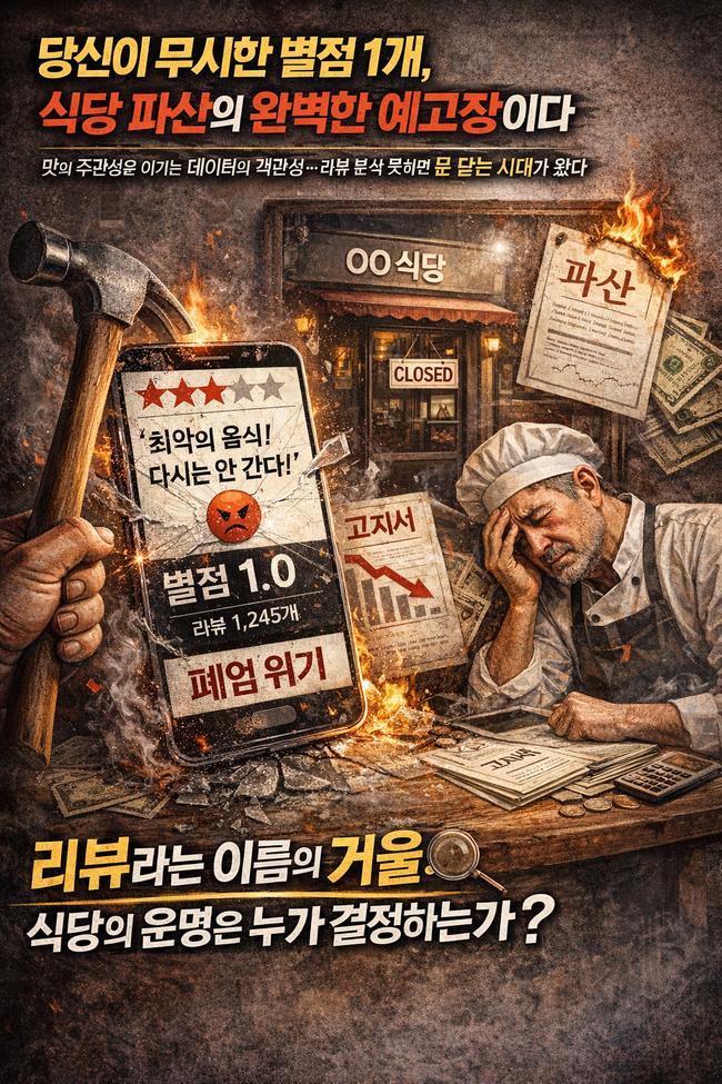 리뷰라는 이름의 거울: 식당의 운명은 누가 결정하는가맛의 주관성을 이기는 데이터의 객관성… 리뷰 분석 못하면 문 닫는 시대가 왔다우리는 흔히 식당의 운명이 주방장의 손끝이나 목 좋은 입지에서 결정된다고 믿어왔다. 그러나 시대가 변했다. 이제 식당의 생사여탈권은 골목 입구가 아니라, 손바닥 위 스마트폰 화면 속 ‘리뷰&r...