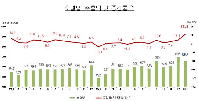 2026년 1월 수출이 658억 달러로 역대 1월 기준 최대치를 기록했다.관세청이 발표한 2026년 1월 수출입 확정치에 따르면, 수출은 전년 동월 대비 33.8% 증가한 658억 달러, 수입은 11.6% 늘어난 571억 달러로 집계됐다. 무역수지는 87억 달러 흑자를 기록하며 12개월 연속 흑자를 이어갔다.1월 수출은 반도체와 승용차 등 주력 품목의 호조에 힘입어 8개...